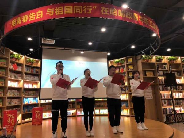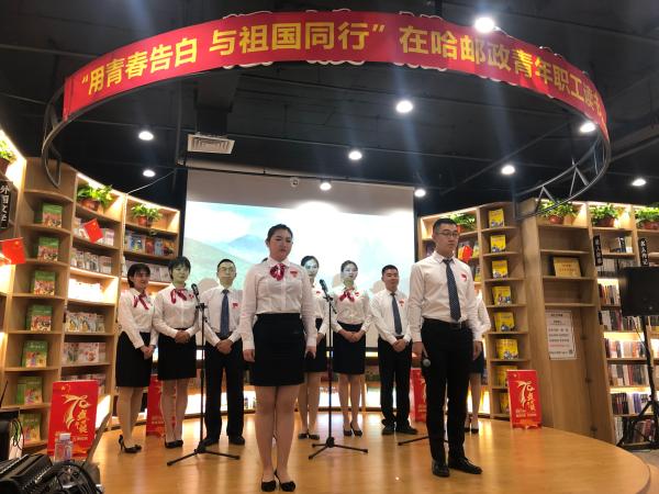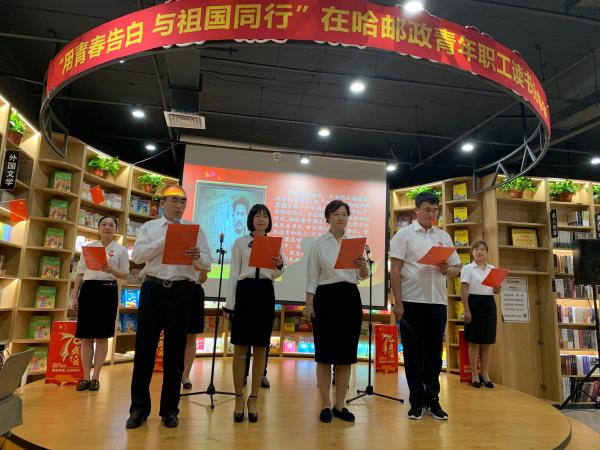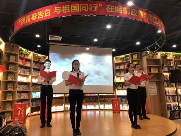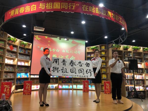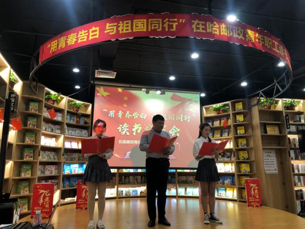 9月27日下午,为热烈庆祝建国70周年,进一步激励青年职工热爱学习、积极向上,营造书香邮政的浓厚氛围,省邮政工会、哈尔滨市分公司报刊发行局党支部、省分公司直属机关团委在邮政汇文书愿举办了“用青春告白 与祖国同行”在哈邮政青年职工庆祝建国70周年读书分享会活动,省寄递事业部、哈尔滨市分公司、哈尔滨邮区中心局、省机要通信局、省信息技术局、省分公司机关、中邮保险黑龙江分公司、中邮证券黑龙江分公司等在哈邮政单位的百余名青年职工参加了此项活动,省分公司党组成员、纪检组组长任宣,省分公司办公室、人力资源部、审计部、党建工作部、集邮与文化传媒部以及省邮政工会的负责人莅临了读书分享会现场。