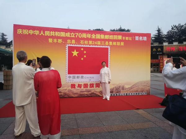 9月27日,中邮重庆市丰都县分公司联合县宣传部在丰都县朝华公园南门举行“全民阅读·书香丰都”暨“壮丽七十年·阔步新时代”全国集邮展重庆丰都站,以及丰都、忠县、石柱三县集邮联展开幕式。本次活动以庆祝新中国成立70周年为主线,以丰富人民群众精神文化生活为总定位,旨在鼓舞人民群众“不忘初心、牢记使命”,为把我国建设成为富强民主文明和谐美丽的社会主义现代化强国、实现中华民族伟大复兴的中国梦不懈奋斗!活动现场开展了同唱国歌,与国旗合影、在线免费听、盖戳打卡等互动活动,得到老百姓的一致肯定。