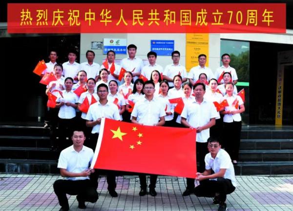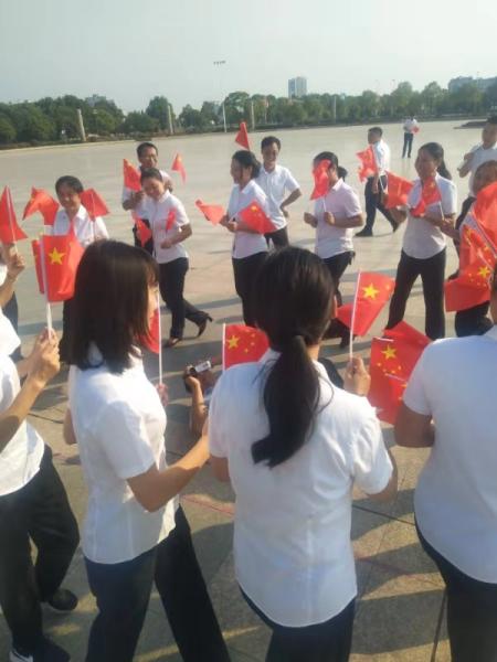 当天下午,活动首先在县分公司大楼门口进行,大家排成两排,手摇国旗,齐声共唱《我和我的祖国》。