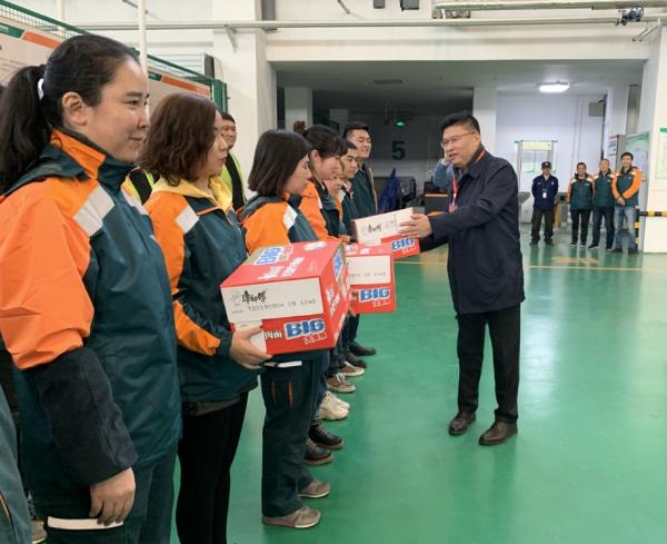 随后,谷德凯常务副主席一行前往基层慰问一线职工。每到一处,谷主席都为一线员工送去方便面、火腿肠、水果等慰问品,并与职工亲切交谈,详细了解业务发展情况,询问“双11”期间投递量的变化、一线职工收入情况等,实地查看了生产作业场地、职工书屋、职工活动室、职工食堂、职工小家、创新工作室等。在太原国际邮件互换局和太原邮区中心局,谷主席对大家积极应对“双11”,全力以赴保时限、保质量、保服务给予充分肯定。他指出,“双11”是创收旺季,一定要注意邮件安全,确保质量和时限,践行好“人民邮政为人民”的服务宗旨,努力打造行业“国家队”。在看到现场忙碌的工作场景后,他叮嘱大家在工作的同时要保护好身体,注意劳逸结合。在朱迎春创新工作室,谷主席认真听取了创新工作室情况,详细了解了推出的创新成果,表示肯定和赞许。特别是对“邮政半挂车厢制动系统加装低气压报警装置”给予高度评价,并现场对如何改进集包封装,提高生产效率、减少职工重复劳动提出建议。他要求创新工作室要起到示范引领和辐射带动作用,从工作实际出发优化工艺流程,特别是在小机具方面有一些革新,不断提高生产效率,充分发挥创新工作室破解工作难题、推动企业创新发展的作用。
