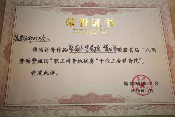 11月17日晚,在省总工会举办的福建省第五届职工文化节闭幕式上,省邮政工会喜获首届“八闽劳动赞祖国”职工抖音挑战赛“十佳工会抖音范”荣誉称号。