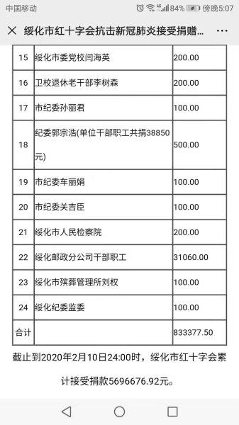 自武汉新冠疫情爆发以来,牵动着14亿中国人民的心。绥化市邮政分公司党委高度重视,时刻关注疫情发展。在当前疫情防控的关键时期,为应对新冠疫情,大力弘扬“人道、博爱、奉献”精神,2月9日上午10时,绥化邮政专门以网络会议的方式召开了总经理办公会议,要求全公司干部职工统一思想和行动,为“战斗”在一线的所有工作人员进行爱心捐款。绥化邮政工会迅速行动,发出疫情防控专项募捐倡议。公司领导班子纷纷献出自己的爱心带头捐款,全体干部职工积极响应。从中午11时至下午17时,仅用了短短6个小时的时间,共有380名干部职工献出爱心,筹集善款达3.1万元。目前全部善款已汇至绥化市红十字会账户,用以支持一线战“疫”。