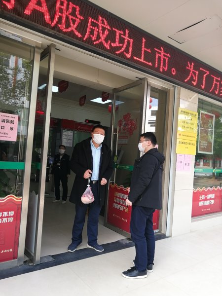 渝水区分公司针对农村自办网点职工小家食堂购买猪肉较困难的情况,在新余市区购买了45斤猪肉,为农村9个自办网点食堂各送去了5斤猪肉。