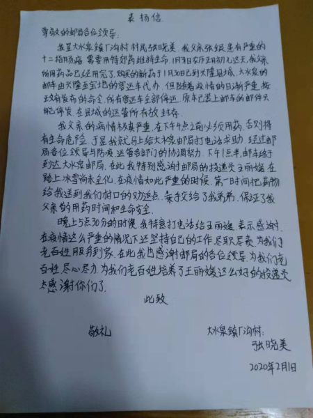 病疫无情人有情。1月31日上午10时25分,承德兴隆县邮政公司大水泉支局接到大水泉乡厂沟村村民张晓美的求助电话,其父因患有严重的十二指肠癌,今天下午4点前必须服用采购的一批特效药,否则就会有生命危险。而购药邮件已于1月30日到达兴隆县城,大水泉邮路由兴隆至宝地客运车代运,由于疫情形势严峻,全县所有客运营运车辆全部停运,原本已装上邮车的邮件只得暂留在县城运管所集中保管。求助就是命令。大水泉支局长程跃接到电话后,立即向兴隆县分公司领导汇报,县分公司领导随即向县新型冠状病毒感染肺炎疫情领导小组进行求助,与交通局沟通协调放车事宜,并安排网运调度员通知客运车辆司机在运管所待命,便于在放车的第一时间将药物紧急运输到大水泉支局,同时,安排一辆邮政车辆在运管所待命,如果协商不成,则专车运输,大水泉邮政支局做好接车及邮件投递相关准备工作。经过多次沟通协调,下午13时35分,代运邮件客车准时到达大水泉支局。邮件一到,女投递员王丽媛立即骑上摩托车向与客户约定好的接收地点出发。当时第二场冬雪尚未融化,沿途路面有结冰现象,十分危险。王丽媛毫无畏惧,因为她的心中只有一个念头,一定要在下午4点之前让客户拿到特效药。下午15时20分,王丽媛在约定地点将邮件递交到客户手中,晚上17时30分,王丽媛接到了张晓美的感谢电话,称其父用药后已脱离危险。这是一次与时间赛跑的投递,这是一次与死神争取时间的投递,疫情面前,承德市兴隆县邮政分公司用实际行动坚守初心与使命,坚决履行央企政治责任、社会责任。