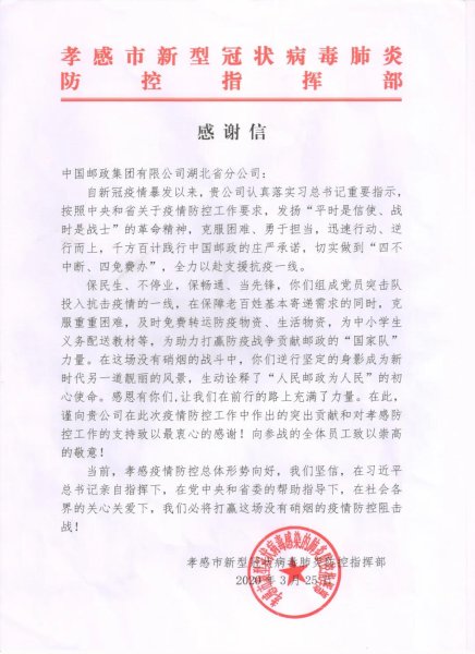 3月25日,湖北省分公司收到了来自孝感市新型冠状病毒肺炎防控指挥部发来的感谢信。信中对湖北邮政发扬“平时是信使、战时是战士”的革命精神,秉承“人民邮政为人民”的初心使命,迅速行动、逆行而上,千方百计践行中国邮政的庄严承诺,切实做到“四不中断、四免费办”,全力以赴支援抗疫一线的做法表示高度肯定和衷心感谢。