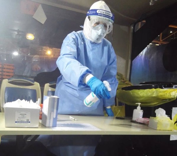 到达浦东机场后,她们的主要任务是采集咽拭子做核酸检测,姑娘们第一时间进入工作区域,经过前轮队员传递岗位信息、传授实战经验,大家快速熟悉工作环境和流程,力争把控操作和采样流程的每个环节都熟记于心,开始了“24小时待命”。上岗第一天就有临时通宵航班任务,姑娘们主动请缨工作通宵,这对刚刚适应穿着防护服、戴着N95口罩防护眼镜工作的人是极大的体力和意志的考验,但是她们没有一句怨言,坚决服从安排,互相打气,誓要以最高质量完成支援任务。同时防护服和防护用具的穿脱是工作中最重要的环节,大家在穿戴后互相帮忙,互相检查,互相指导,不容许丝毫马虎和疏漏,坚决做到一旦进采样点就要保证规范、避免交叉感染,百分之百确保防护安全。