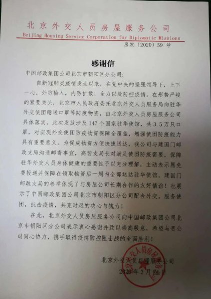 日前,北京外交人员房屋服务公司向朝阳区分公司发来感谢信,对建国门邮政支局为该公司向147个国家驻华使馆投递防疫物资工作予以的大力支持表示感谢。 来信表示:在形势严峻的紧要关头,北京市人民政府委托我方向驻华外交使团赠送口罩等防疫物资,此次发放涉及147个国家驻华使馆,共3.5万只口罩,对实现外交使团防疫物资保障全覆盖,增强使团防疫能力具有重要意义。建国门邮政支局相关负责人主动表示愿意免费投递并保障在领取物资后一周内全部送达驻华使馆。此善举展现了北京邮政配合外交,服务使团,抗击疫情,共克时艰的决心与魄力。(北京邮政工会)