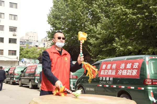 誓师大会在运营中心樱桃揽收战士们的擂鼓声中拉开帷幕,运营中心机关管理人员、区域经理、揽投部经理组成气势雄宏的党员助农先锋队,鸣鼓挥旗,为今年的樱桃寄递揽收鼓劲助势。