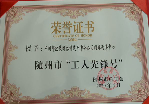 4月29日,在随州市庆祝“五一”国际劳动节暨表彰大会上,随州分公司网路运营中心被市总工会授予随州市“工人先锋号”。