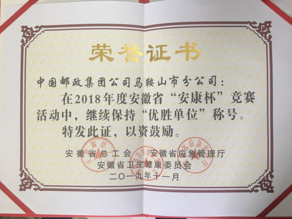 4月20日下午,市总工会召开全市工会十二届十二次全体(扩大)会议,会上马鞍山市邮政市分公司受到表彰,荣获“2018年度安徽省安康杯竞赛优胜单位”称号。 安徽省“安康杯”竞赛是在省委、省政府的坚强领导下,按照中华全国总工会和国家安全生产监督管理总局的统一部署,全省企事业单位积极参与,以“广泛发动提质量,文化引领强基础”为主题的“安康杯”竞赛活动,是安全生产最高荣誉奖牌。