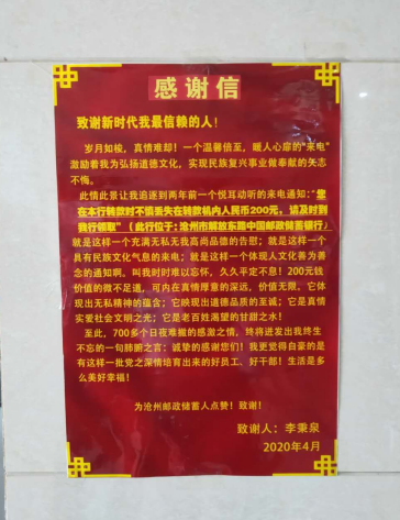 原来,2018年的一天黄昏,一位保定的客户来到解放中路营业所,想办理转帐业务。但因为已经下班,柜台无法再为客户办理业务。理财经理就带着客户到厅外的自助柜员机上办理。等客户走后,理财经理想去自动柜员机防护仓里打扫卫生,恰巧看到机器台面上放着200元钞票,理财经理马上意识到这一定是刚才转帐的客户落下的,于是马上去追,但人已经找不到了。随后,营业所工作人员通过账户信息,费了一番周折后,才联系到了客户并将钱转给了客户。近日,这位客户因到沧州处理业务,专程来到了解放中路营业所,送给了营业员一张特别制作的大幅感谢信,并专门为此事制作了一个小视频为营业员们播放,以表达自己心中的感激之情。