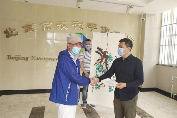5月13日,一辆银灰色的汽车缓缓驶入北京市报刊零售公司停车场,一位老人拿着布口袋在同事的陪同下向大门走去。发行局副局长王波、零售业务室主任王靖赶紧走下台阶迎接老人,与老人握手致意。“这是我的一点心意,感谢绿衣人不畏疫情、风雨无阻地为百姓服务,你们和白衣天使一样值得大家崇敬。”话音未落,老人将一幅画卷展开,一株丽质芳姿的绿色梅花映入大家的眼帘,画上还写着一行字:“与民一滴水,民报予涌泉。”