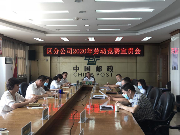 6月12日分公司组织学习、传达贯彻落实中国邮政集团有限公司关于2020年度劳动竞赛文件、会议精神和2020年区分公司工作会议精神,确保将工作落到实处。圆满完成2020年任务目标。