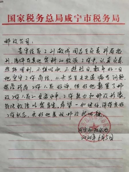 “刘敬成同志认真负责、热情周到、不惧风雨、不避烈日,数年如一日地坚守工作岗位,从未发生丢失、遗漏等问题,深受我局工作人员好评……”近日,咸宁市邮政分公司收到一封来自咸宁市税务局手写的表扬信,信中高度赞扬该分公司温泉城区投递站投递员刘敬成在日常工作中认真热情,无丢失、无遗漏,默默坚守岗位的精神风貌。刘敬成究竟做了什么,能得到客户如此肯定?