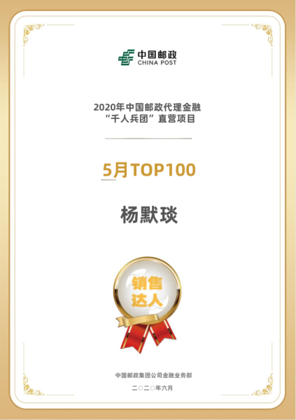 6月23日,由中国邮政集团有限公司举办的2020年中国邮政代理金融 “千人兵团”大作战营销活动5月TOP100销售达人名单揭晓,广水分公司航空路支局理财经理杨默琰以全国第12名的成绩登上榜单!