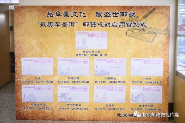 自从祈福邮局和老北京胡同邮局开业以来,两个主题邮局的邮政日戳备受集邮者青睐,而支局陆续推出的“福”字邮资机戳、二维码“生肖祈福”系列邮资机戳、“春夏秋冬”邮资机戳和“最美阜景街”、“西四北八条”邮资机戳等,特别是“最美阜景街”系列邮资机宣传戳,分别选取鲁迅故居、白塔寺、历代帝王庙、广济寺、中国地质博物馆、万松老人塔、北海公园、北海团城、景山等9处极具代表性历史文化景点,设计中以城墙为统一边框,表现传统文化与现代经济交汇融合,七百年“最美阜景街” 邮资机全景展现,深受周边百姓和集邮爱好者欢迎。(北京邮政工会)