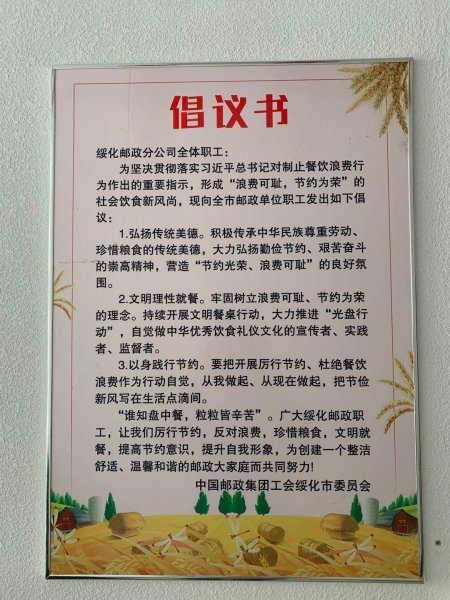 该邮政工会运用多种方式开展活动,一是制定下发了活动方案;二是通过职工微信群、钉钉群下发光盘行动倡议书,三是在食堂制做立式宣传展架,张贴“拒绝浪费”等宣传画;四是将倡议书录制成音频在职工就餐时循环播放,营造出良好的节约氛围;五是每日餐后“光盘”的职工,赠送水果或酸奶一份。活动于10月26日开展以来,绥邮职工积极响应,成效显著,基本杜绝了浪费的现象,人人都成为光荣的“光盘侠”。