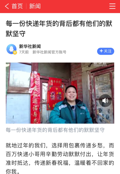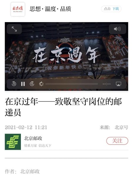 多渠道齐发力。春节期间,北京邮政推出特别策划短片,聚焦“留京过年” 讲述北京邮政投递员留京过年,坚守岗位的动人故事——《每一份快递年货的背后都有他们的默默坚守》。短片生动诠释了北京邮政人响应国家号召在京过年、坚守岗位的故事,赢得广泛关注,取得了良好的宣传效果。短片在新华社客户端、北京日报客户端、 中国邮政报微信平台、腾讯网、凤凰网、 好看视频、芒果TV、网易视频、京邮宣传中心视频号等多渠道、多平台同步播出。截至22日,据不完全统计, 合计浏览量超过80万次。