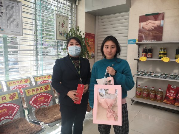 在3月8日国际妇女节这天,邮储银行翠峰路支行向一位特殊的女客户送上一份惊喜,表达了邮政人员的诚挚情谊与节日祝福。