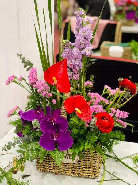 本次活动,上海邮政工会特地邀请了市插花协会资深大师为员工讲解插花工艺及技巧,并带领大家实操练习,完成了一组花篮造型。 学员们认真地按照老师的示范剪枝、插花,现场气氛热烈融洽。大伙儿用自己灵巧的双手,将原本普普通通的花草,根据不同的色彩、形状整合到一起,一束束独具匠心又包含深意的插花作品跃然眼前。