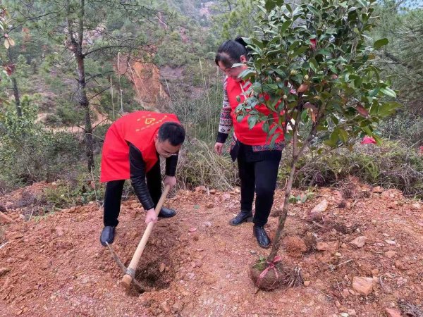 在植树活动现场,大家自觉组队,分工协作,有的挥锹挖坑,有的扶苗培土,大家穿梭往来,现场一片热火朝天的劳动景象。