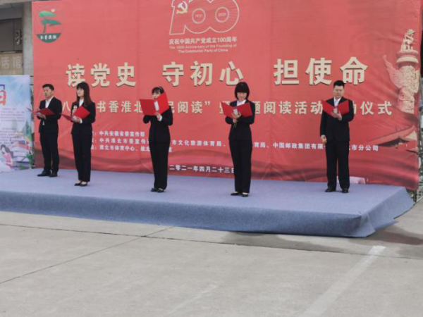 “423世界读书日”到来之际,淮北市分公司工会积极开展读书活动,并抽调5人参加淮北市“读党史 守初心 担使命”——第八届“书香淮北 全民阅读”暨主题阅读活动。 4月23日上午9时,主题活动在市体育场如期举行。此次主题活动由安徽省委宣传部主办,淮北市委宣传部、市文旅体局、市教育局、淮北市邮政公司联合承办,市体育中心、市图书馆协办。 淮北市委宣传部副部长吴鸿雁讲话并宣布活动正式启动,新时代乡村阅读榜样梁红宣读全民阅读倡议书。