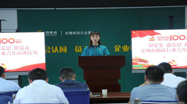 6月9日,由亳州市邮政管理局举办的知党史、感党恩、跟党走庆祝中国共产党成立 100周年快递行业青年演讲比赛在亳州市邮政分公司11楼会议室举行,选手们通过生动鲜活讲故事的形式,讴歌中国共产党在各个历史时期铸就的伟大精神,讲述各自在工作中学党史、悟思想、办实事的真实故事,激发全市邮政快递业广大党员干部职工在新时代抒发知党、爱党、颂党的真情实感。来自全市快递行业的12名选手参加了比赛。 通过近四个小时的激烈角逐,来自亳州市邮政分公司选派的张萌、毛娜娜、王家存三名选手,分别取得一、二、三等奖的好成绩。 参赛选手张萌、毛娜娜、王家存表示,本次演讲比赛极大激发了自己干事创业的热情,今后将结合党史学习教育,不断增强自己的政治判断力、政治领悟力、政治执行力,发扬为民服务孺子牛、开拓创新拓荒牛、艰苦奋斗老黄牛精神,努力在本职岗位干出一流业绩。