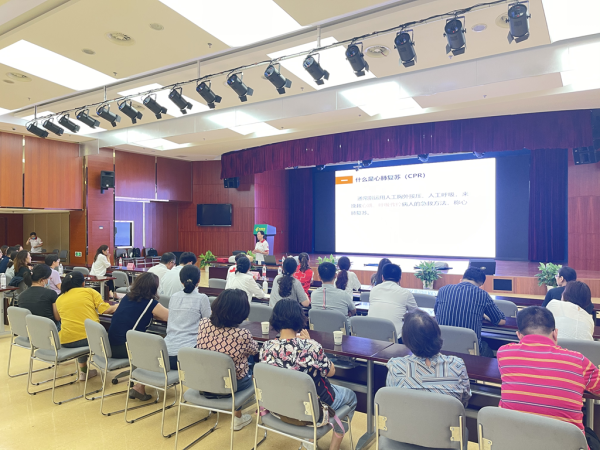 培训会上,南京市红十字会培训老师用通俗幽默的语言就心肺复苏相关理论知识进行了讲解,强调了学习心肺复苏术的重要性,讲述了如何通过意识、呼吸、心跳,判断救助者是否属于心肺复苏患者,介绍了心肺复苏术的两个部分:胸外心脏按压、人工呼吸,并具体讲解了救助过程中需要注意的问题和经常出现的错误,最后教给大家判断心脏复苏有效的指征。