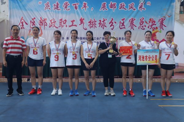 区分公司副总经理、工会主席吴全兵出席了比赛闭幕式并为获奖代表队颁奖。“庆建党百年,展邮政风采”全区邮政职工气排球分区赛总决赛圆满落下帷幕。