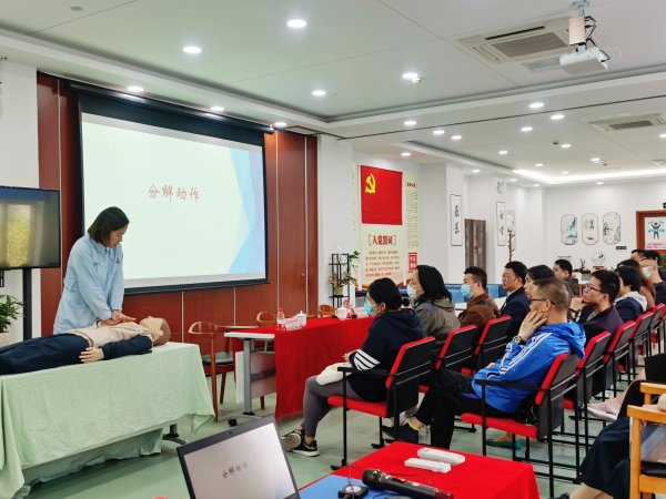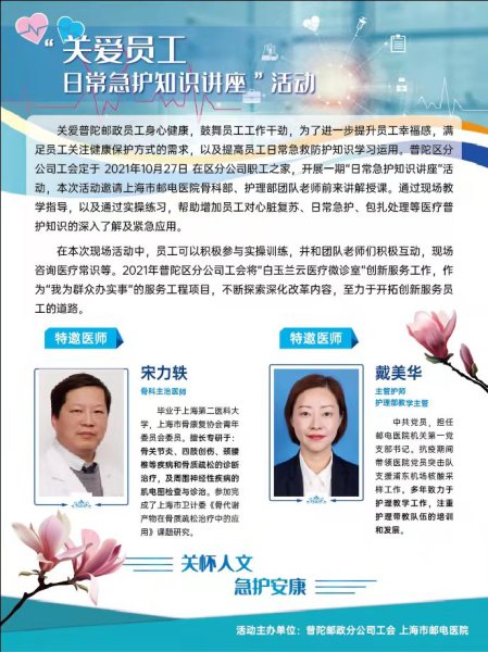 本次活动邀请了上海市邮电医院骨科部、护理部团队医师前来讲解授课。通过专业、生动、丰富的现场教学指导,以及让员工积极参与实操练习,帮助员工增加对心脏复苏、日常急护、包扎处理等医疗普护知识的深入了解及紧急应用方法。下一步将继续开展各项员工关注的养身知识、防疫知识、健康体检、职业病防护等医疗方面的讲座活动。