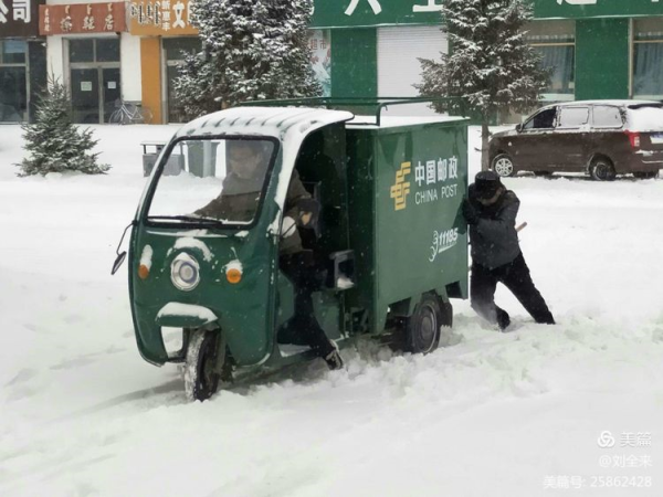 虽然邮路、道段被冰雪覆盖,车辆难以通行。但在这纷飞飘扬的雪花中,有了“娘家人”的温暖,随处可见那抹“邮政绿”。他们坚守岗位,不畏严寒,步履匆匆逆雪而行穿梭于大街小巷、奔波于商家客户的身影,他们满载客户期待,从心出发,尽最大努力将每一封邮件、每一份报纸、每一件包裹及时送到用户手中的画面勾勒出了一幅幅“人民邮政为人民”的感人画卷。