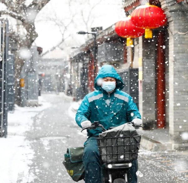 北京2022年的第一场雪,在大寒节气如期而至。节日气氛的红灯笼与风雪无阻的绿色互相映衬,成为冬日最亮眼的风景线。一场场飞雪染尽大街小巷,勾勒出在严冬行驶的邮政车辆,也酝酿着动人的邮政精神。