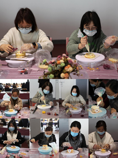 同时,工会还邀请了西点师来带领女神们自己动手制作精美的蛋糕。从做蛋糕前的准备到蛋胚的摆放,奶油的涂抹,再用新鲜水果装饰,女神们现学现做,将自己的创意充分地表达在作品中,忙得不亦乐乎。最终,一份份精致的蛋糕作品从每个人手中脱颖而出,收获了满满的快乐和惊喜。