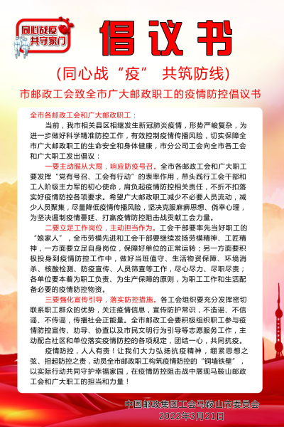 近日,马鞍山市新冠疫情暴发,给全市邮政生产服务造成较严重影响,致使投递等服务开展艰难,全市约4.6万件邮件积压,11个网点停业。为了抗疫情、保生产,马鞍山市邮政工会第一时间向全市广大邮政职工发出《同心战“疫” 共筑防线》疫情防控倡议书,号召全市干部职工想方设法克服困难,组织全市人员加班送、驻点送,同时乡镇网点20多处职工住在职工小家,坚守岗位,确保邮政服务不间断。