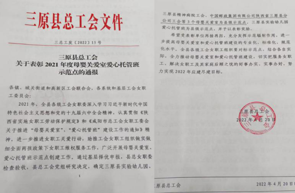 近日,陕西省三原县邮政工会喜获2021年度“母婴关爱室县级示范点”荣誉称号。