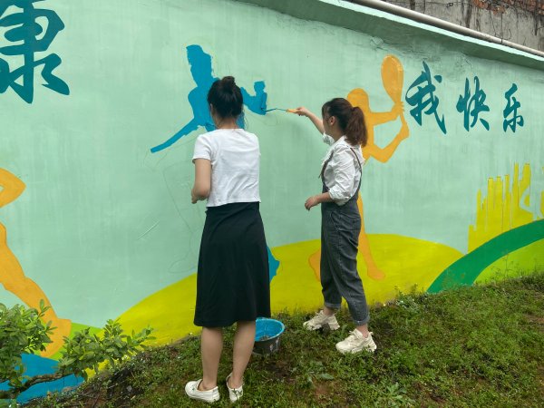 在崇阳县分公司的支持下,他们买来涂料,利用休息时间开始了彩绘墙的工作。补墙灰、涂料调色、图案设计、绘制等工作均由自已动手完成。负责绘画主笔的是今年刚入职的大学生员工黄靖,大学专业是环境设计的她具有很强的绘画功底。大家分工协作,一笔一画认真绘制,“我运动 我健康 我快乐”的主题彩绘墙很快完工。