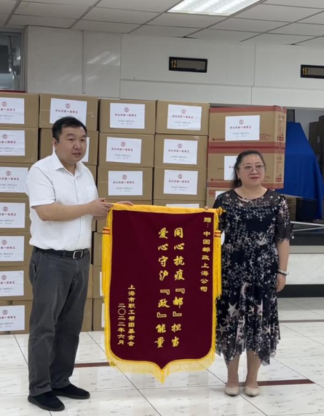 为表达诚挚的谢意,上海市职工帮困基金会向邮政工会赠予锦旗,上书“同心抗疫‘邮’担当,爱心守护‘政’能量”。同时还捐赠了酸奶、面包、坚果等物资百余箱。双方领导表示未来在微心愿寄递、爱心超市直配、即时物流配送等方面会有更深度的合作,通过双方的共同努力,将温暖及时、高效送达有需要的人。(上海邮政工会)
