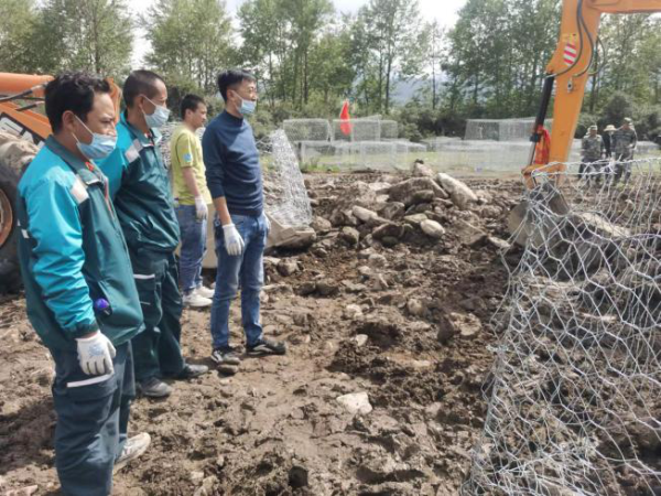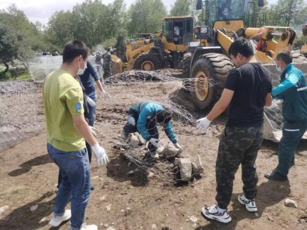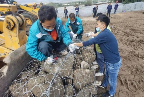 在防汛抗洪一线,员工们分工协作,有人做铁笼有人搬石块,有人将石块填入铁网中,利用填装石笼加固河道。