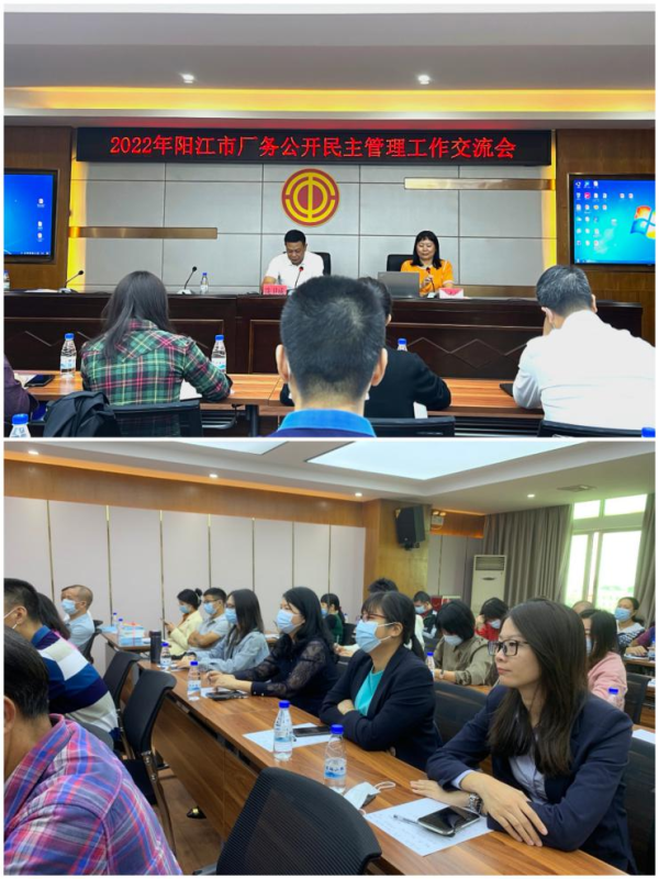 会上阳江市总工会负责人分析了目前阳江全市厂务公开民主管理工作的基本形势及下阶段的主要任务,介绍了厂务公开民主管理法律法规,还观看了三名来自非公企业、事业单位的厂务公开民主管理的课件分享展示,并听取了这些企业在开展民主管理工作的经验收获,指出存在困难、提出解决办法。