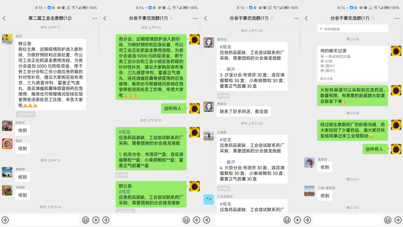 采购防疫应急药品是近日工会工作群里最热门的话题。面对应急药品紧缺的难题,各级行政、工会想方设法,积极联系药厂、药店,齐心协力解决问题。