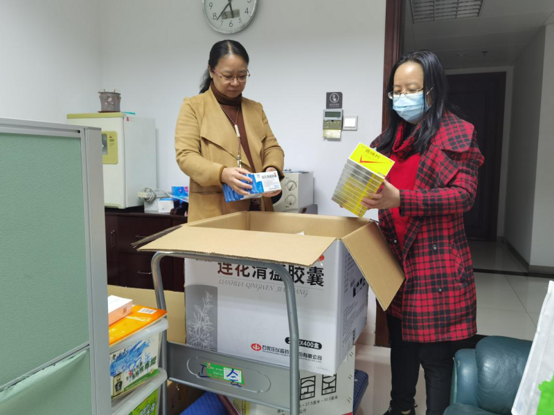 中山市分公司工会副主席胡明带头联系当地药厂,为基层单位抢购紧缺药品,第一时间在办公室做分配