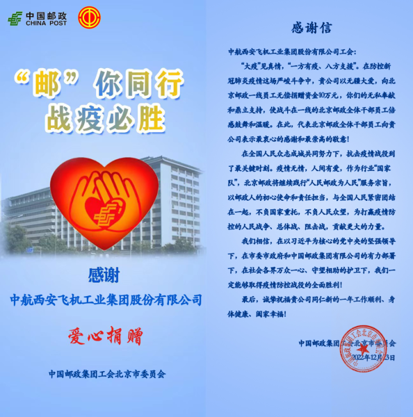 12月22日,北京市邮政工会收到中航西安飞机工业集团股份有限公司工会捐赠的10万元,表达了该公司对北京邮政一线投递人员的慰问与关爱。