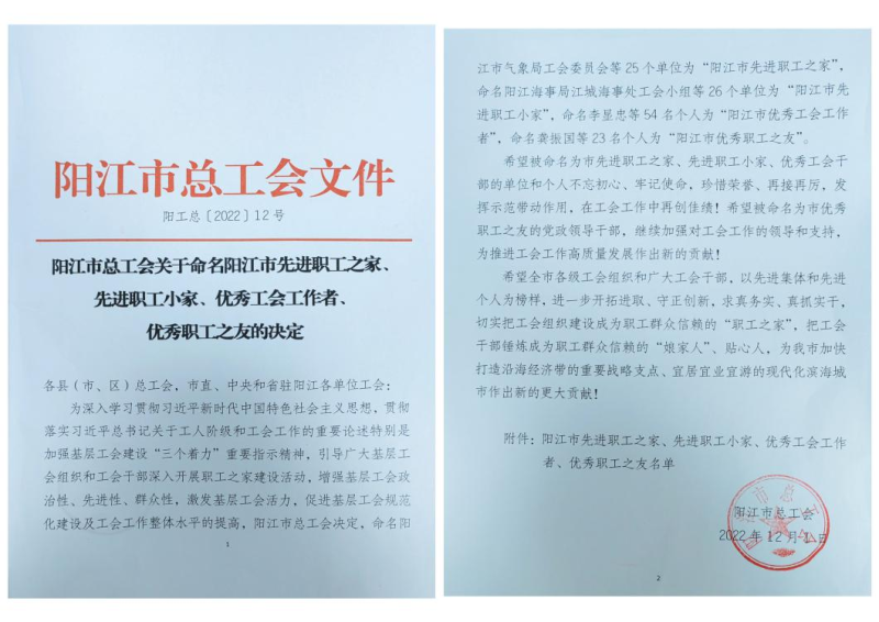 日前,阳江市总工会印发了《阳江市总工会关于命名阳江市先进职工之家、先进职工小家、市优秀工会工作者、优秀职工之友的决定》,阳江市分公司阳东塘坪、阳春春湾、阳西新圩等3个支局工会小组荣获“阳江市先进职工小家”,阳江市分公司党委书记、总经理马志雄,阳东区分公司党委书记、总经理曾春意等2名同志荣获“阳江市优秀职工之友”称号,工会谭庆蕊荣获“阳江市优秀工会工作者”称号。