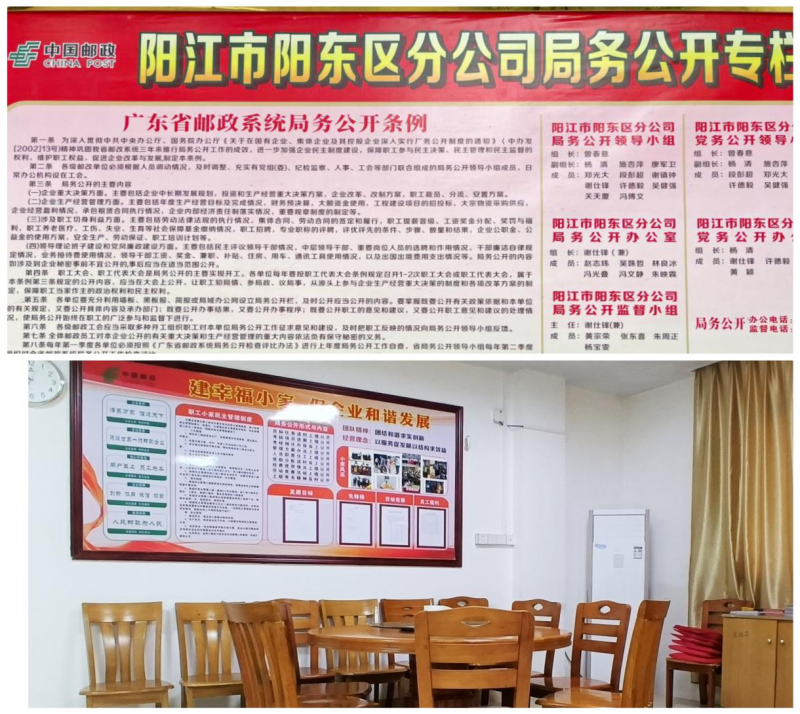 近年来,阳江阳东区分公司始终以习近平新时代中国特色社会主义思想为指导,认真学习贯彻习近平总书记关于工人阶级和工会工作的重要论述精神,坚持全心全意依靠工人阶级的指导方针,把民主管理集体协商作为企业法人治理,构建和谐劳动关系的重中之重,健全“四个机制”,紧扣“三个重点”,推进厂务公开管理工作,取得了显著的业绩,先后荣获“广东省五一劳动奖状”“全国模范职工之家”“全国邮政系统先进集体”等多项荣誉表彰。