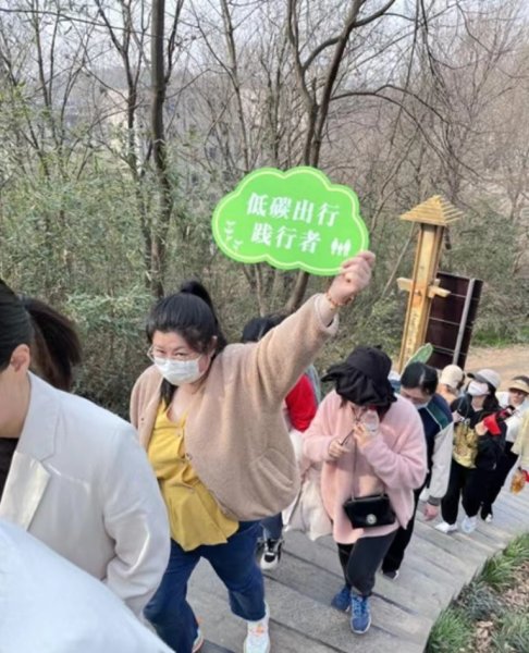 “低碳出行践行者”“绿色生活推动者”,一块块响亮的标语牌,宛如一条绿色的丝带,将登山的女神们像珍珠一般串联起来,形成了一幅精致和谐、生机盎然的美好画面。