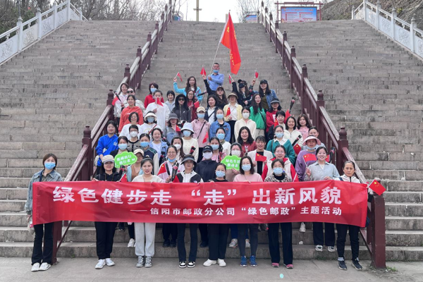 信阳邮政百余名女职工相聚平桥区平山塔,开展“绿色健步走 走出新风貌”主题登山活动,宣传“绿色邮政”理念,倡导低碳健康生活方式。
