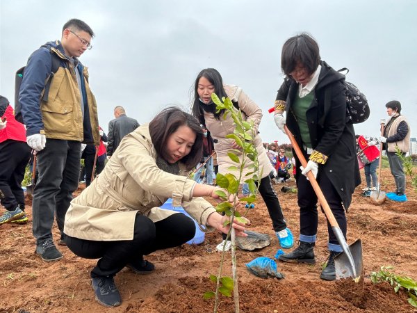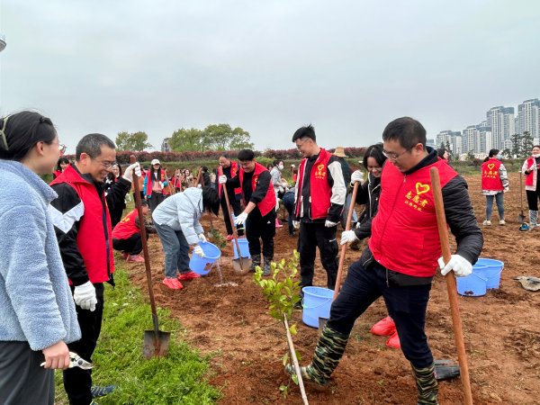 挥锹铲土、培土围堰、提水浇灌……现场参与活动的干部职工干劲十足、热情高涨,在江西省农业科学院园艺研究所技术人员的指导下,或两人一组,或三五搭档,种下一棵棵柚子树苗。大约经过1个小时的劳动,大家合力种下的35棵柚子树苗在春风中摇曳,焕发出春天的盎然生机。