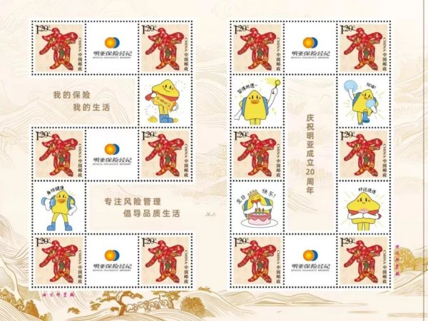 邮票的设计理念是本次方案的核心。此次个性化邮票的设计理念以明亚保险的历程、成就和文化为核心,巧妙地将公司成立20周年的元素融入邮票设计中,既体现了公司的品牌形象,又凸显了邮票的收藏价值。从设计稿的审查、印刷设备的校准,到印刷过程的质量监控,每一步都执行了严格的质量管控,确保每一枚邮票都能达到最高的品质标准。