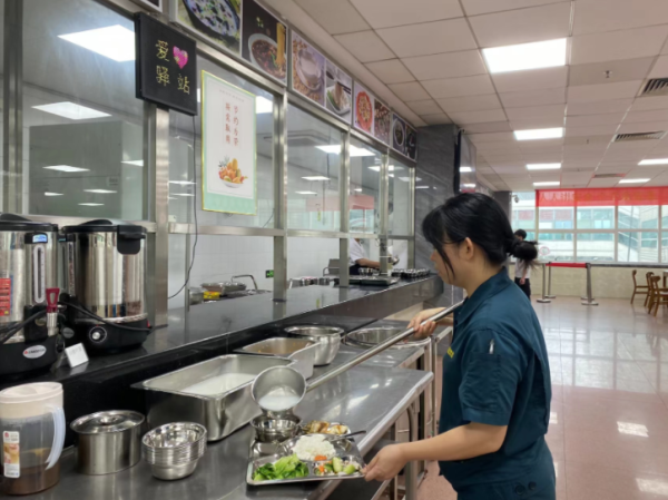 同样细心、周到的服务还体现在自助取用区,员工们可以根据食量自由选择“小碗汤”或者“大碗汤”,也可以按需加饭,有效减少了餐饮浪费。墙上张贴着的“珍惜粮食,拒绝浪费”等系列宣传画,无声却有力地传达着勤俭节约的美德,成为食堂内一道亮丽的文化风景线。