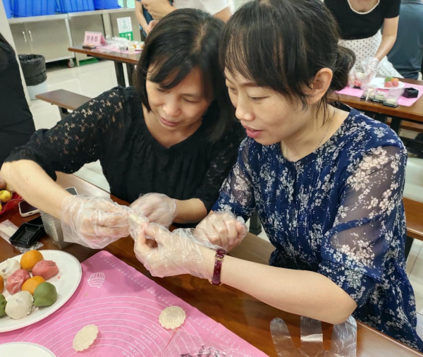 大家根据自己的口味和喜好,挑选了新鲜丰富的食材馅料,将它们裹入晶莹剔透的软糯冰皮中,并用模具压制成型,在饼面印上精美的花纹图案,制作出了精致美味的冰皮月饼。